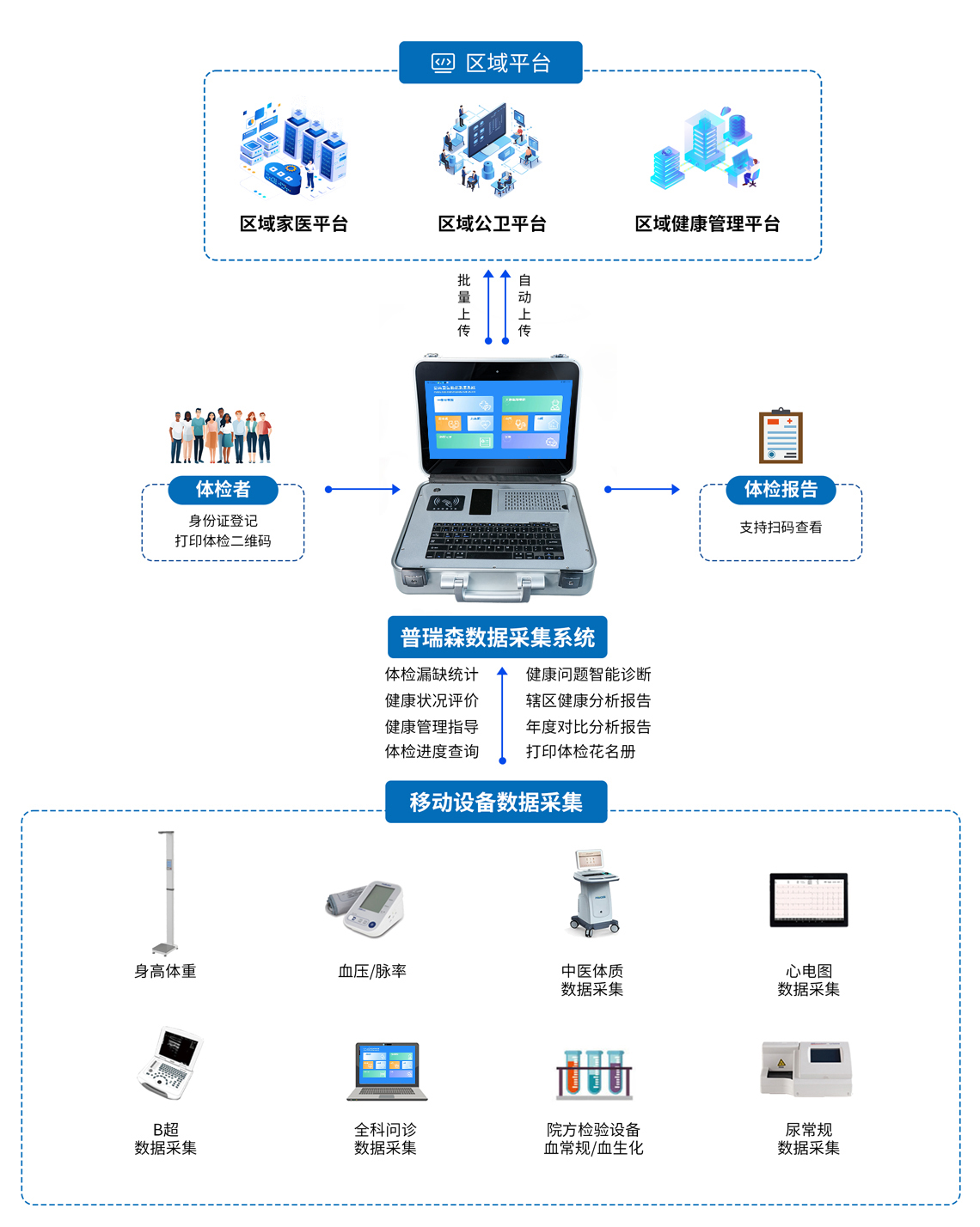 该系统按照县、乡、村三级应用设计,以便捷式应用、智能化应用、多场景应用为导向,按照满足院内专业体检、下乡便携式体检、移动体检车体检及区域化融合体检等多种模式搭建,为基层医疗机构公共卫生信息化最后一公里提供一站式解决方案,实现国家“让数据多跑路,百姓少跑腿”的相关要求。