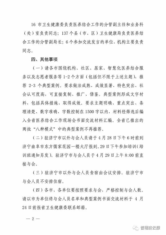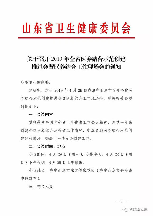 2019年全省医养结合示范创建推进会暨医养结合工作现场会2019年4月29日上午8时左右,山东普瑞森医疗设备股份有限公司各部门负责人在王总的带领下参加在曲阜市举行的“2019年全省医养结合示范创建推进会暨医养结合工作现场会”,并陪同省卫健委领导参观小雪社区卫生服务中心医养结合示范点。