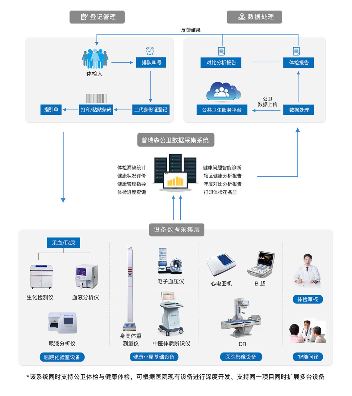 普瑞森公共卫生数据智能采集系统院内专业体检方案,是在基层医疗机构搭建一套适用于公卫体检、健康体检、健康教育、健康管理为一体的健康管理中心,深度集成公共卫生体检基础设备,无缝链接医疗机构现有的心电设备、超声检查设备、化验室设备,结合内科、外科、中医科等科室专业问诊,实现居民快速建档,体检数据自动采集,体检报告自助打印、体检数据自动上传至当地基本公共卫生服务平台的全功能应用。