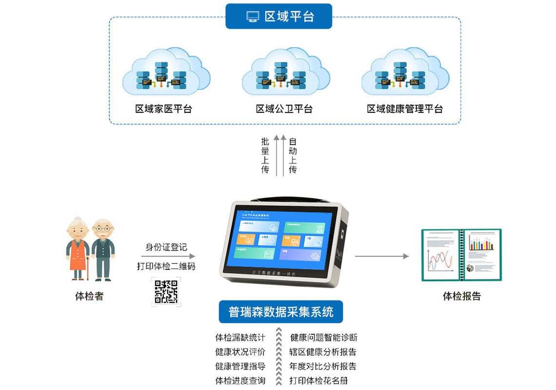 该系统按照县、乡、村三级应用设计,以便捷式应用、智能化应用、多场景应用为导向,按照满足院内专业体检、下乡便携式体检、移动体检车体检及区域化融合体检等多种模式搭建,为基层医疗机构公共卫生信息化最后一公里提供一站式解决方案,实现国家“让数据多跑路,百姓少跑腿”的相关要求。
