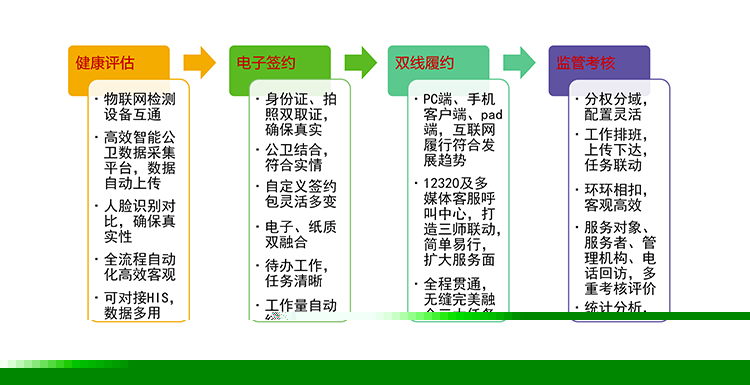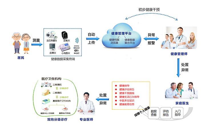 家庭医生签约平台是实施家庭健康管理的服务平台,它在社区范围内,以家庭为单位,由社区卫生服务中心和区域医疗卫生协同服务体系提供支撑,建立居民健康档案为分级诊疗制度建设逐步形成基层首诊、双向转诊、急慢分治、上下联动的分级诊疗和就医真正政 策落地模式,全方位的生命体征采集和检测,线上线下的数据干预,为家庭成员提供综合、连续、有效的基本卫生服务。