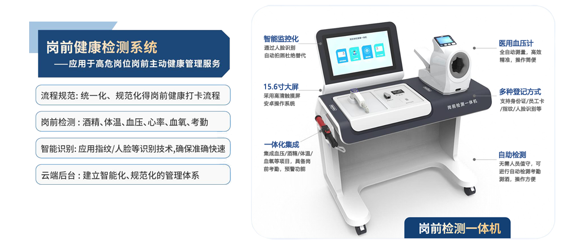 岗前健康检查一体机是一种用于进行员工健康检查和筛查的设备,可以通过指纹识别、人脸识别等方式快速登录,并可准确地检测员 工的健康状况,包括 血压、心率、酒精、体温、血氧 等多个项目,对于符合上岗健康状态得员工允许考勤打卡。