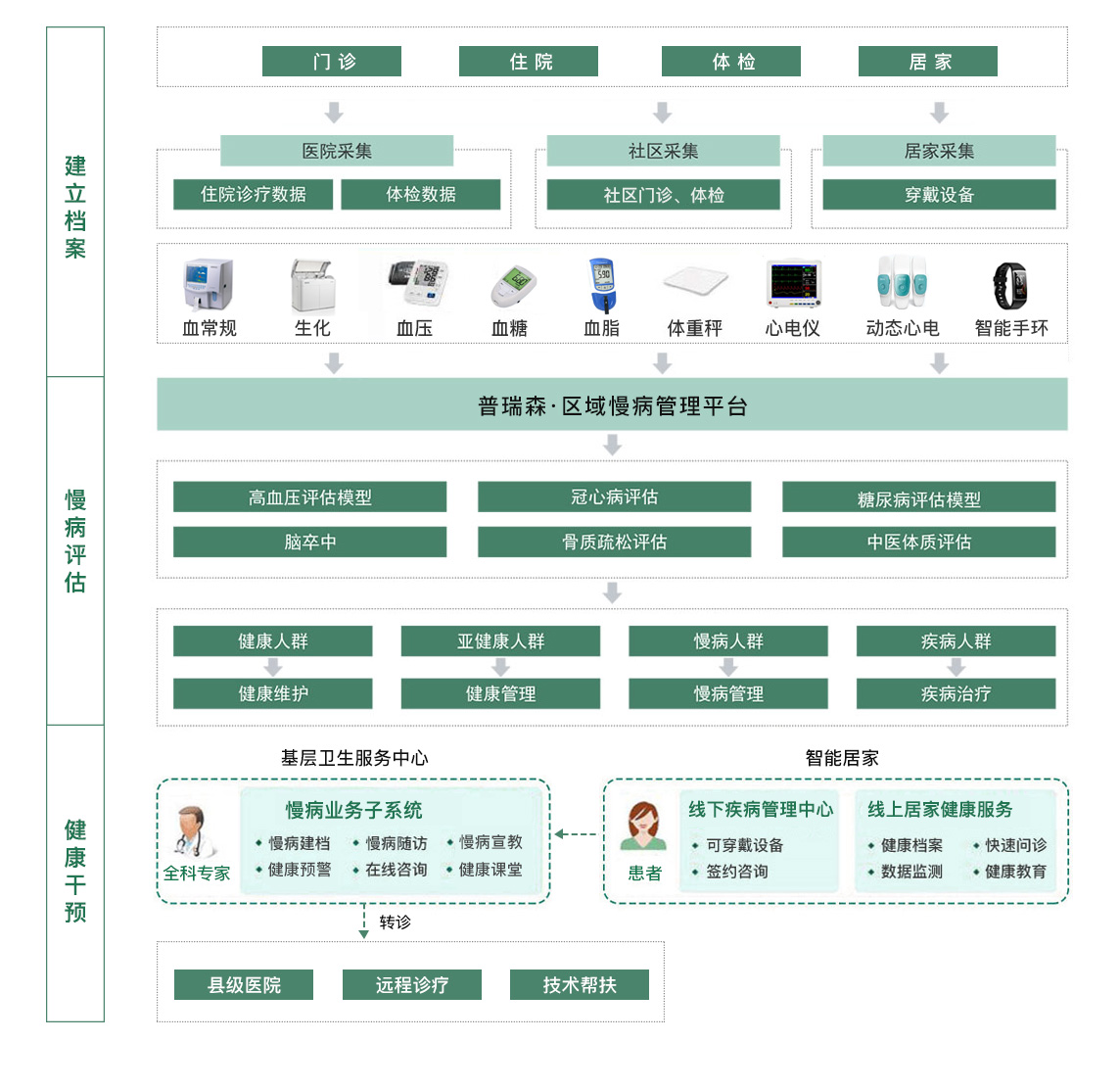 Âý²¡¹ÜÀíÕûÌå½â¾ö·½°¸Í¨¹ý½¨Á¢Ò»¸ö¸²¸ÇÒ½Ôº¡¢ÉçÇø·þÎñÖÐÐÄ¡¢ÏçÕòÎÀÉúÔºÒÔ¼°´åÎÀÉúÊÒµÄÇøÓòÂý²¡¹ÜÀíÆ½Ì¨£¬Í¨¹ýÕûºÏÃÅÕסԺ¡¢Ìå¼ìµÈ½¡¿µÊý¾ÝºÍ²É¼¯Âý²¡½¡¿µ×ÔÖúÒ»Ìå»ú¡¢½¡¿µËæ·Ã°üµÈÉ豸½¡¿µÐÅÏ¢£¬´òÔìÇøÓòÂý²¡´óÊý¾ÝÖÐÐÄ£¬Îªµ±µØÂý²¡¸ßΣ»¼Õß½øÐиßЧɸѡ¡¢ÓÐЧÆÀ¹À¡¢¾«×¼¸ÉÔ¤¡¢¼°Ê±Ëæ·ÃµÈÒ»Ì廯µÄ½¡¿µ¹ÜÀí±Õ»··þÎñ£¬´Ó¶ø¿ìËÙ´òÔìÂý²¡·ÀÖθÉÔ¤µÄÈý¼¶£¨¶þ¼¶Ò½Ôº¡¢ÏçÕòÎÀÉúÔº/ÉçÇøÎÀÉúÔº¡¢´åÎÀÉúÊÒ£©·þÎñÌåϵ£¬ÓÐЧÌá¸ßÂý²¡¹ÜÀíµÄЧÂÊ¡£