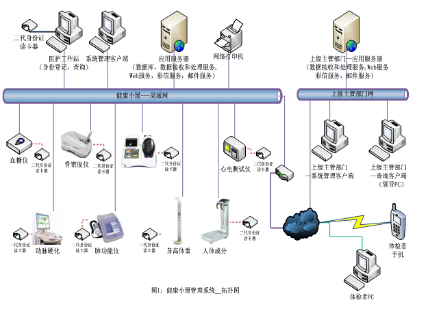 社区健康小屋一体化实施方案,包含有一台主控计算机、一个由该主控计算机控制的身高体重仪、血压仪、血糖仪、肺功能仪、动脉硬化检测仪、骨密度检测仪、心电仪