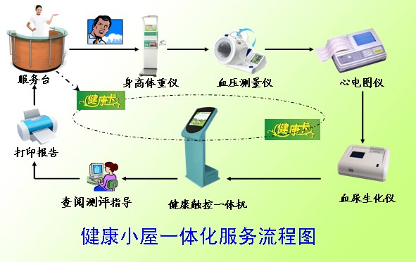 健康小屋操作流程 1、社区老人先到服务台凭借一卡通标签换取“身份识别卡”; 2、将卡在其中之一的体检测评单元的登陆装置正确识别后,卡内加密数据经由主机通过网