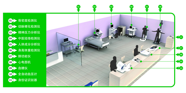 ×ÔÖúʽ½¡¿µÐ¡ÎÝÖ÷ÒªÅ䱸Ðĵçͼ¡¢ÈËÌåÖ¬·¾¡¢ÑªÑ¹¡¢Éí¸ßÌåÖØ¡¢¹ÇÃܶȡ¢ÑªÌÇ¡¢·Î¹¦Äܼ°ÐÄѪ¹Ü¹¦Äܰ˸ö¼ì²âÏîÄ¿¡£È«²¿Íê³Éºó»á´òÓ¡±¨¸æµ¥£¬Í¬Ê±»¹Óн¡¿µÖªÊ¶µÄÐû½Ì¡£